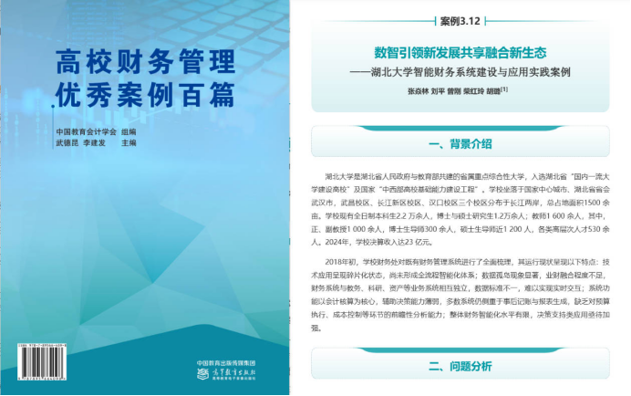 近日,由中国教育会计学会全国范围内组织评选、高等教育出版社出版的《高校财务管理优秀案例百篇》正式发布。我处张焱林团队撰写的《数智引领新发展共享融合新生态——湖北大学智能财务系统建设与应用实践案例》成功入选,彰显了我校在智能财务方面的创新成果与示范作用。